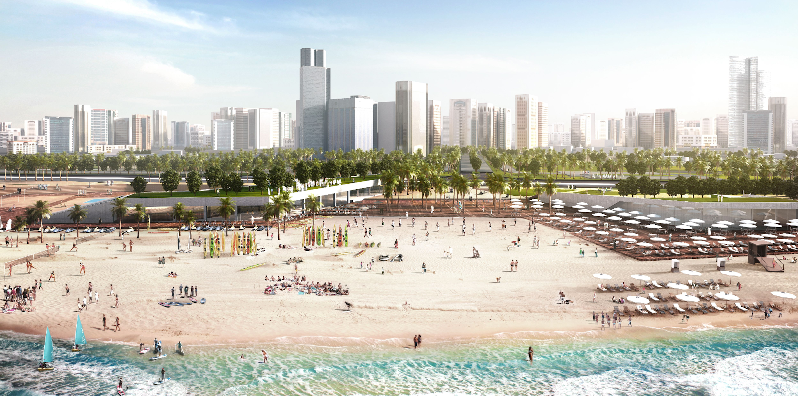 The waterfront is popular with both tourists and locals alike, offering stunning views of the turquoise sea and the surrounding skyline of skyscrapers.