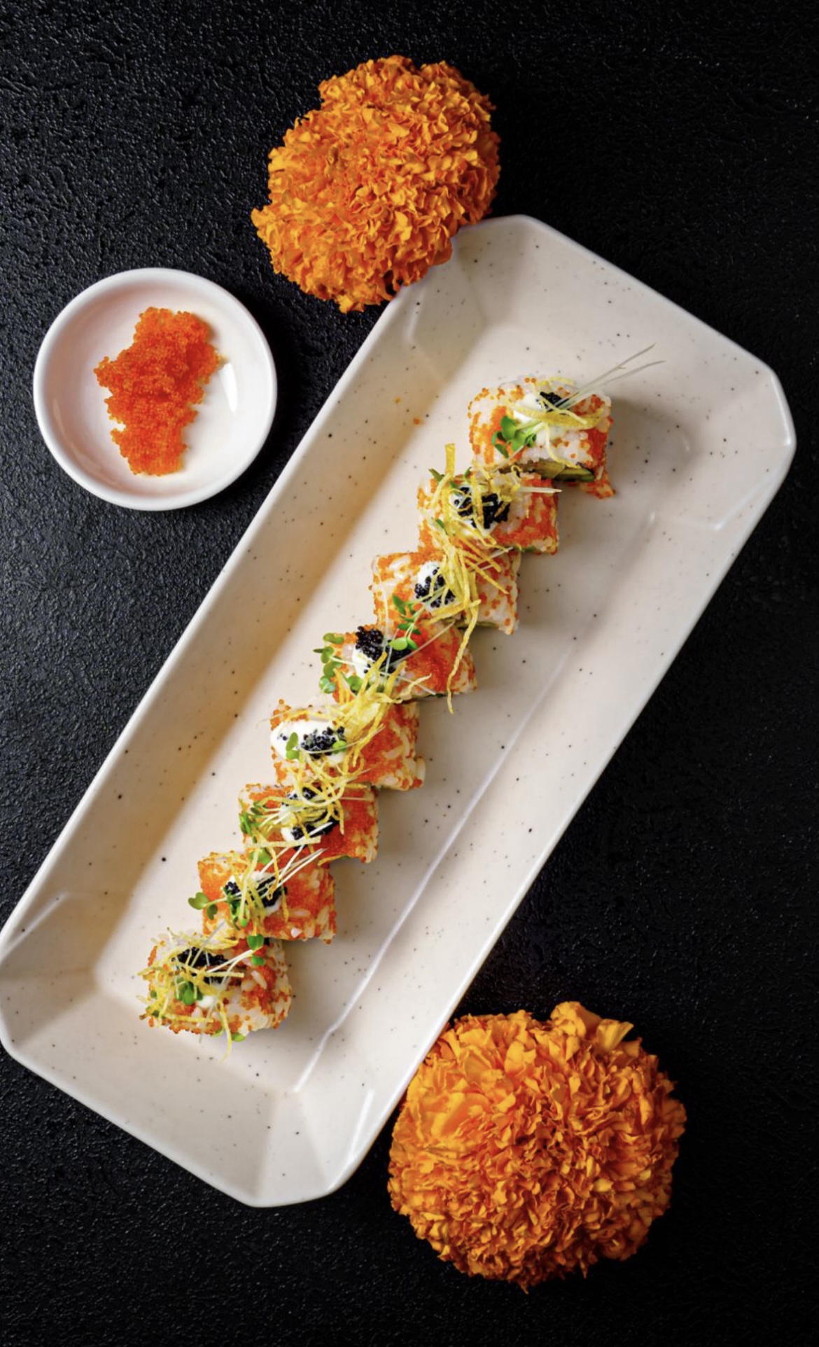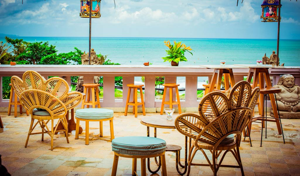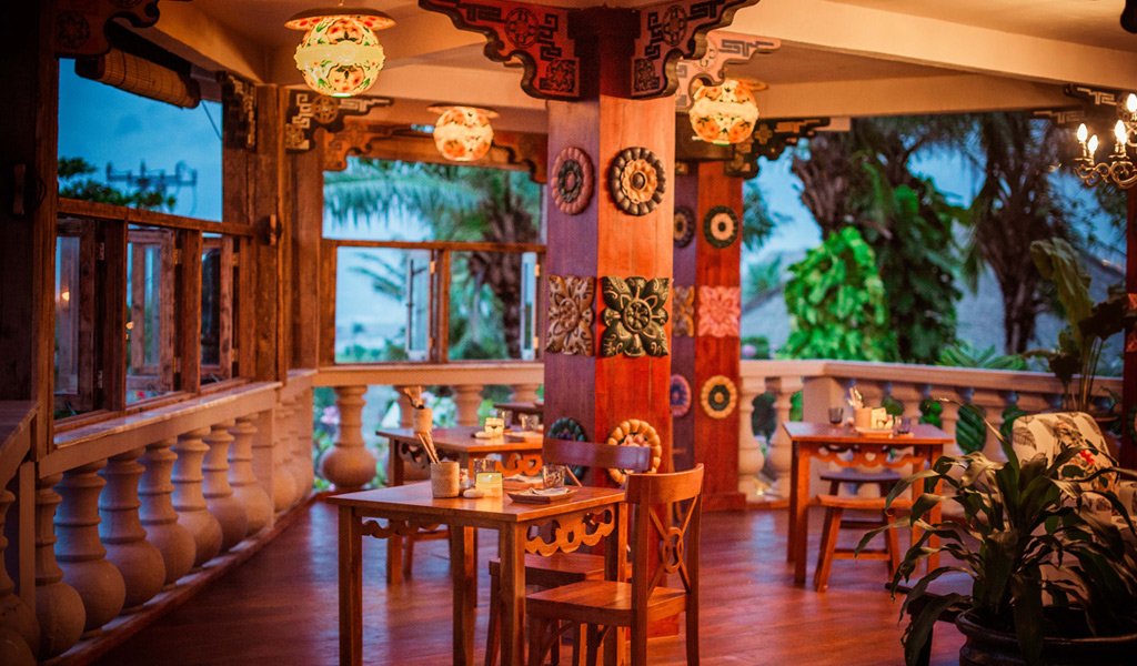 A stylish East Asian restaurant in Canggu, Bali, blending modern Japanese fusion with elements of Indonesian, Indian, and Thai cuisine, set in an interior with antique-inspired details and ocean views.