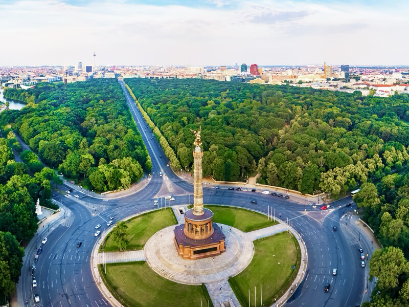 Tiergarten is Berlin’s largest central park, covering around 210 hectares and offering an ideal space for прогулок and relaxation. At its heart stands the Victory Column on Großer Stern, crowned with a gilded statue of Victoria and featuring an observation deck. Nearby are the Soviet War Memorial with tanks and artillery, Bellevue Palace (the residence of the German president), and St. Matthew’s Church.