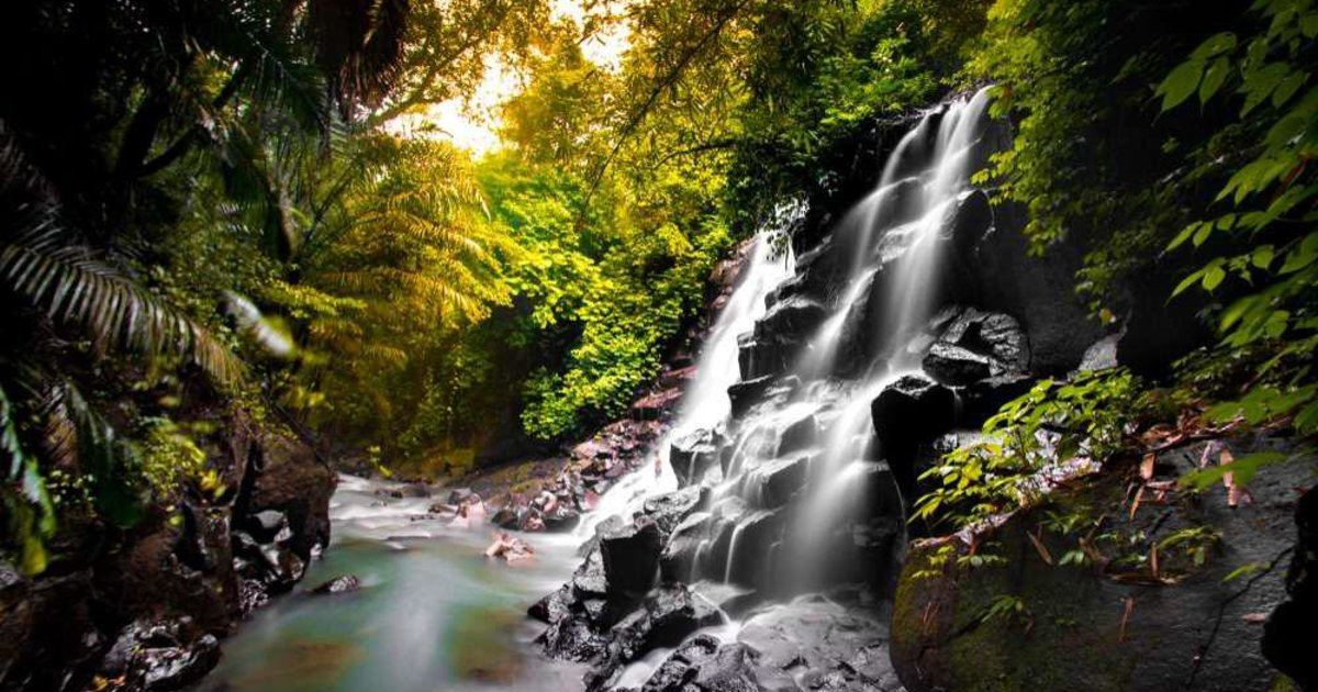 Живописный многоступенчатый водопад в районе Гианьяр на Бали, где вода стекает по чёрным скалам в мелкий пруд для купания. Он находится в 30 минутах езды от Убуда.