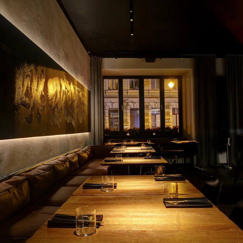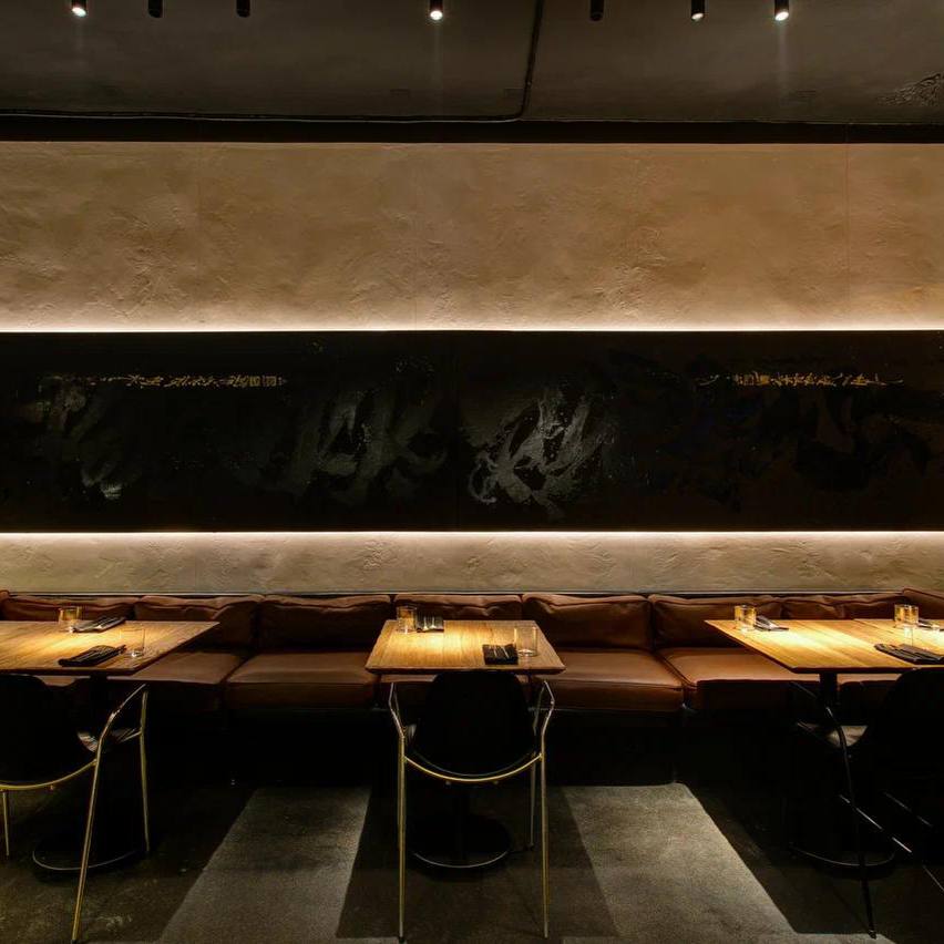 Ресторан авторской азиатской кухни с интерьером в стиле крафтовой посуды и каллиграфии Покраса Лампаса. Открытая кухня позволяет наблюдать за процессом приготовления блюд.
