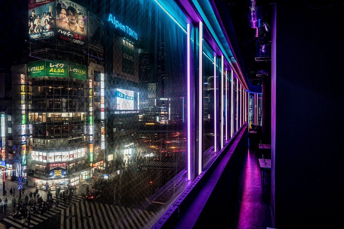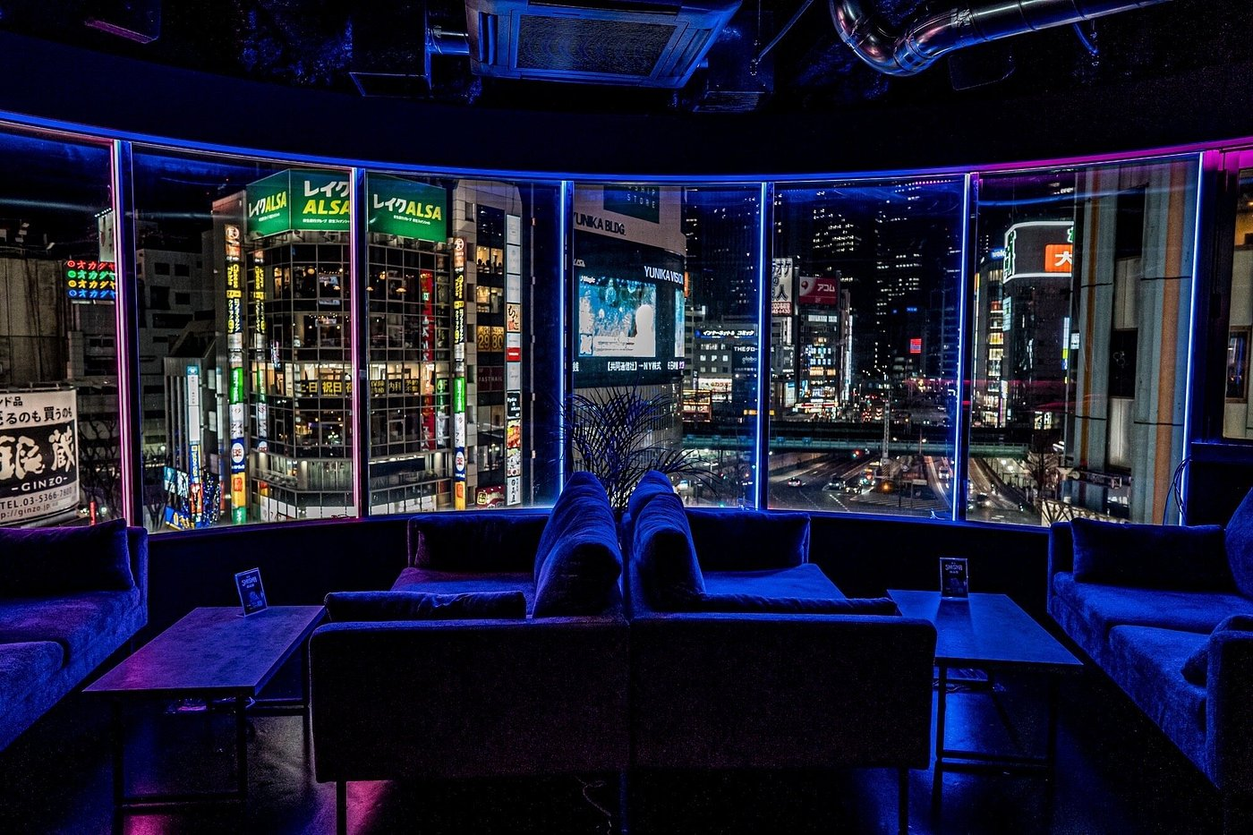 Shisha bar with a cyberpunk atmosphere and a view of Kabukicho. Inside, projectors, music and lights create a unique atmosphere. Convenient outlets for work, delicious shisha and neon Tokyo out the window.